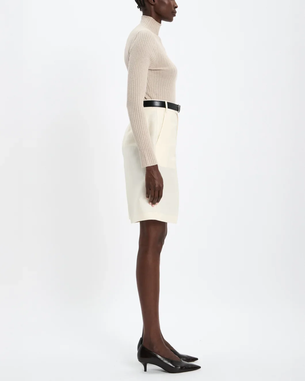 The Ariana Sweater in Feather by Arch4 is a high neck, ribbed top crafted in a lightweight, baby goat cashmere with a fitted silhouette and long sleeves.Â