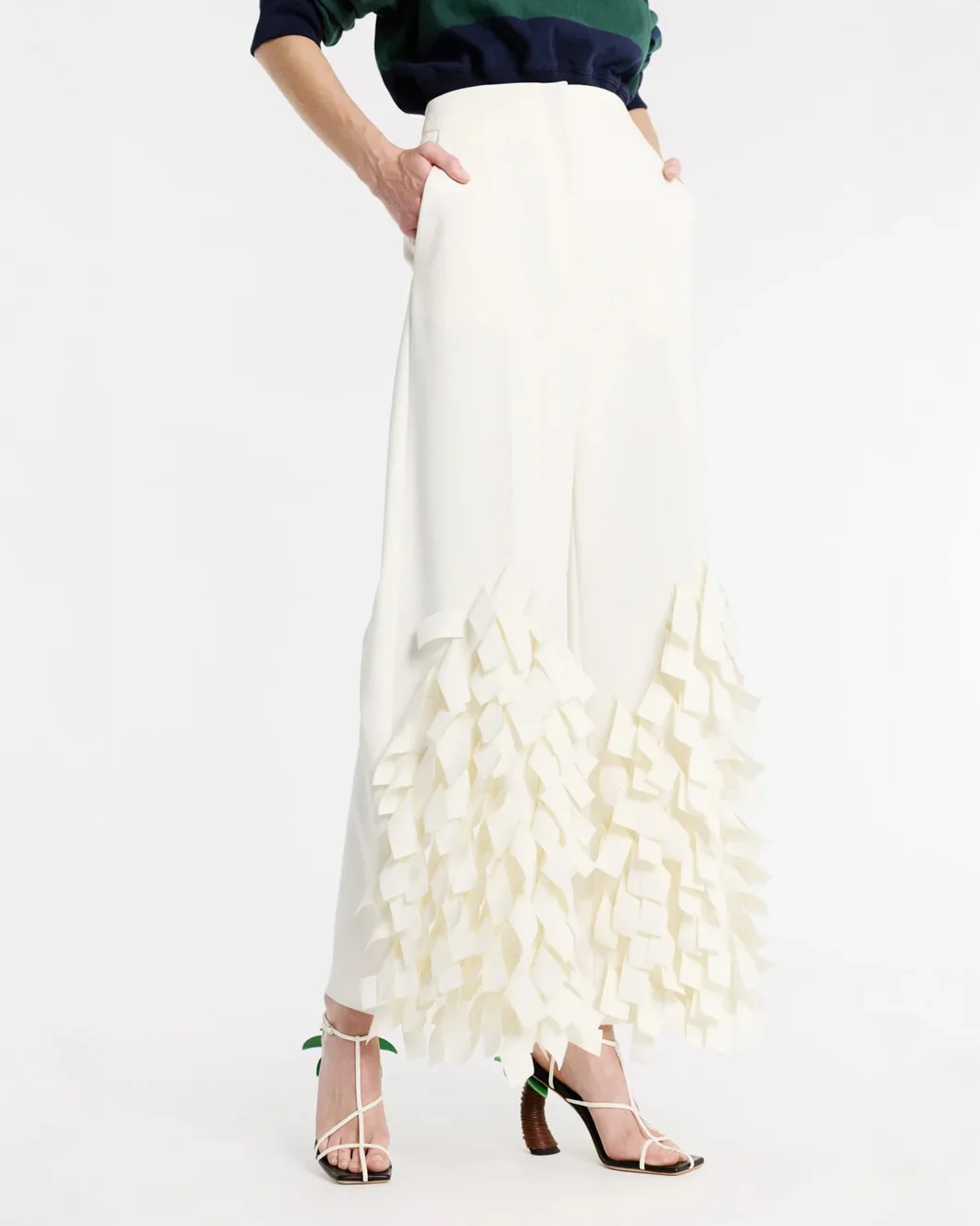 The Culottes with Rectangle Detail in Ivory by A.W.A.K.E. Mode is a wide-leg, high waisted culotte crafted in a comfortable stretch-crepe with rectangular appliquĂ© at the hem.Â