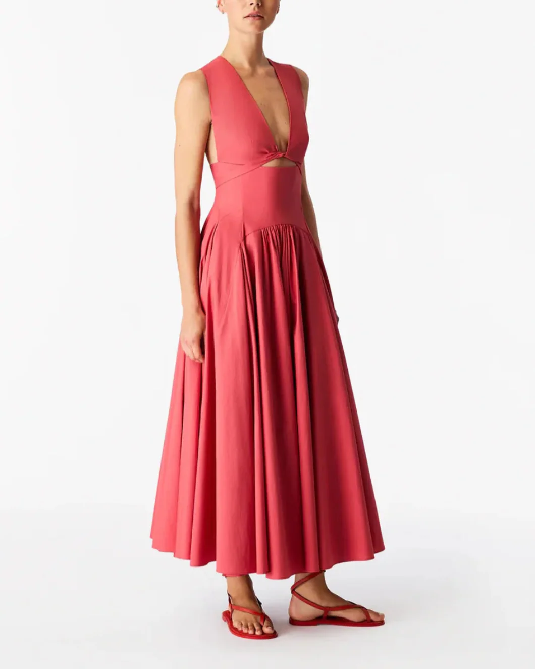 The functional wrapping at the torso of this dress creates a cutout at the center front, which can be adjusted. The fullness of the skirt is enhanced by curved seaming details at the waist. This dress closes with an invisible zipper at the center back.