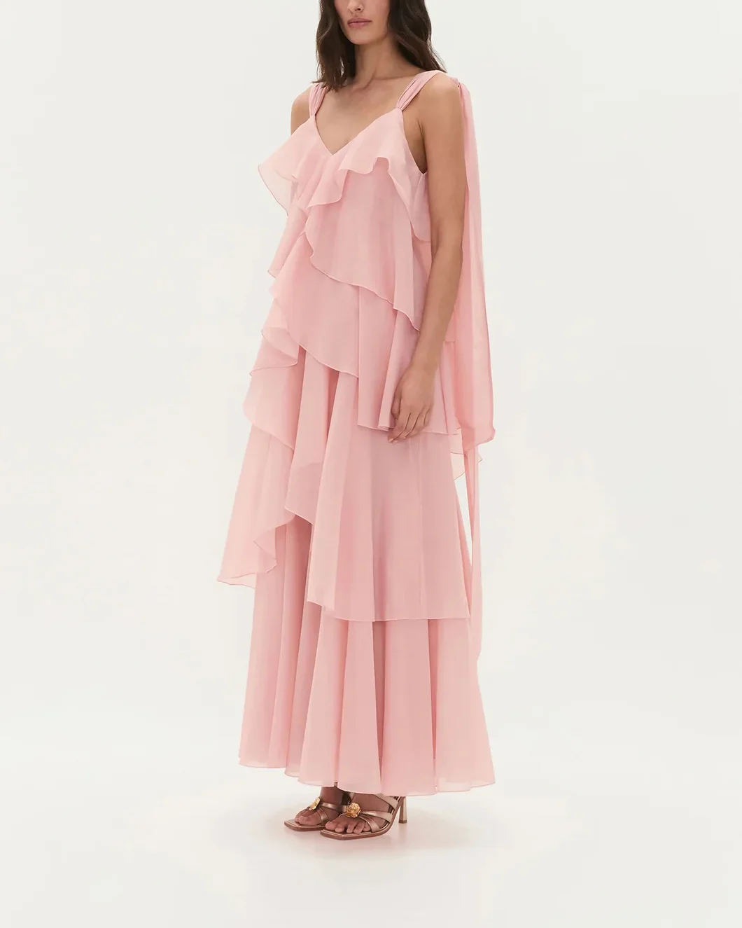 The Gracie Maxi Dress in Muted Rose by Aje is a v-neck, ruffle tiered maxi dress featuring tie back straps with bows.Â