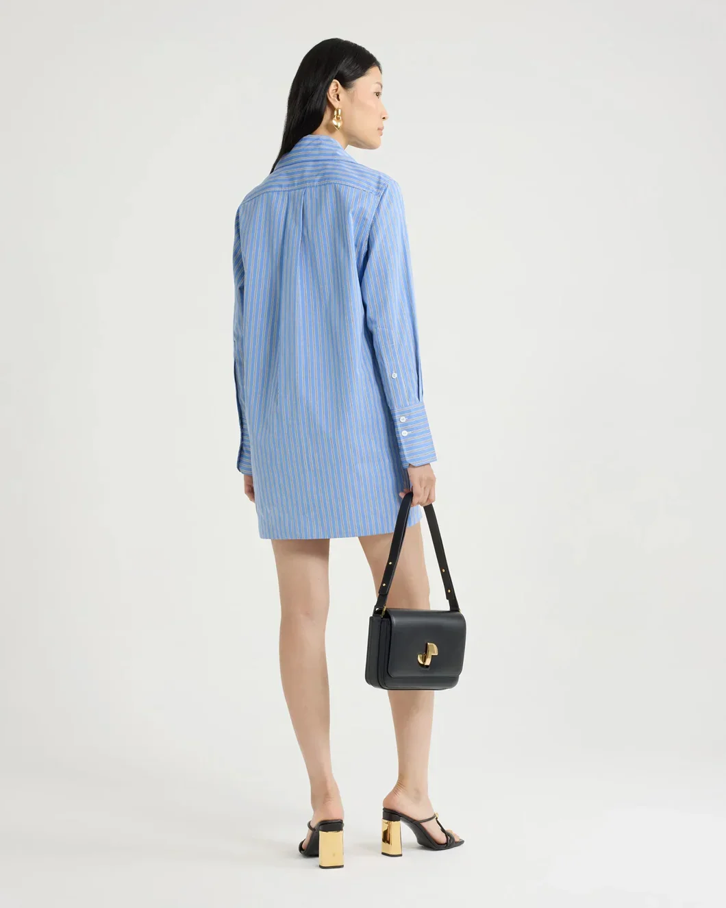 The Mini Poplin Shirt Dress in Heritage Blue Stripes by Patou is a long sleeve, collared dress featuring two side slit pockets and button front placket crafted in a stripe pattern.Â