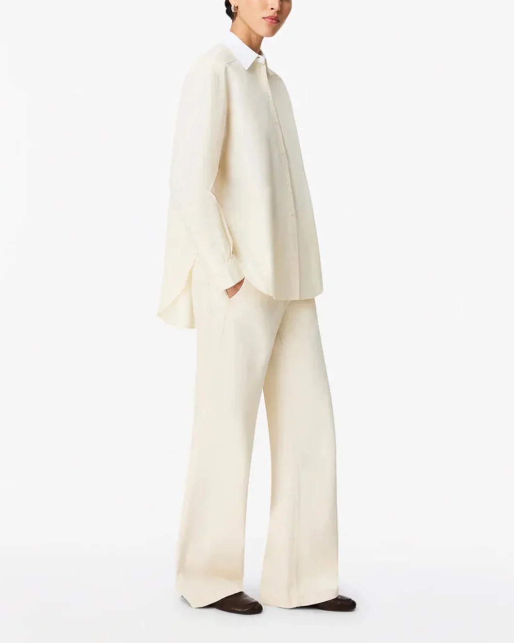 The Pleat Back Shirt in Ecru and White by Another Tomorrow is an oversized shirt featuring dropped shoulders and a curved hem with high cuts at the side.