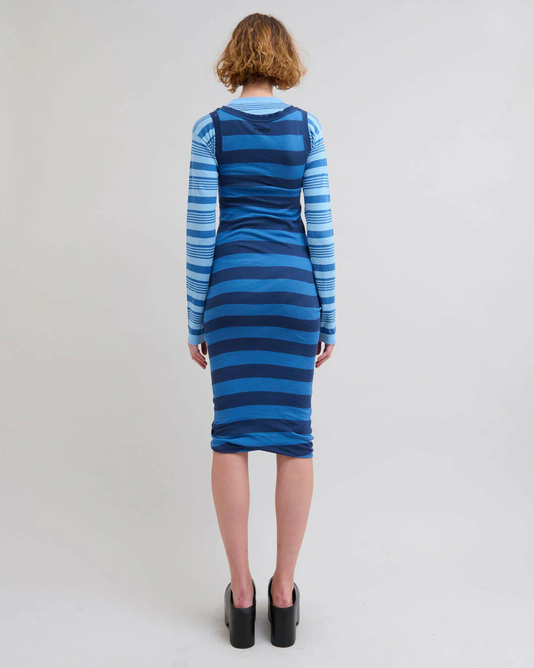 The Striped Overlap Dress in Faded Cotton Stripes by Marni is a long-sleeve crew neck dress with an overlapped sleeveless boat neck dress creating a mix of two different stripes.Â